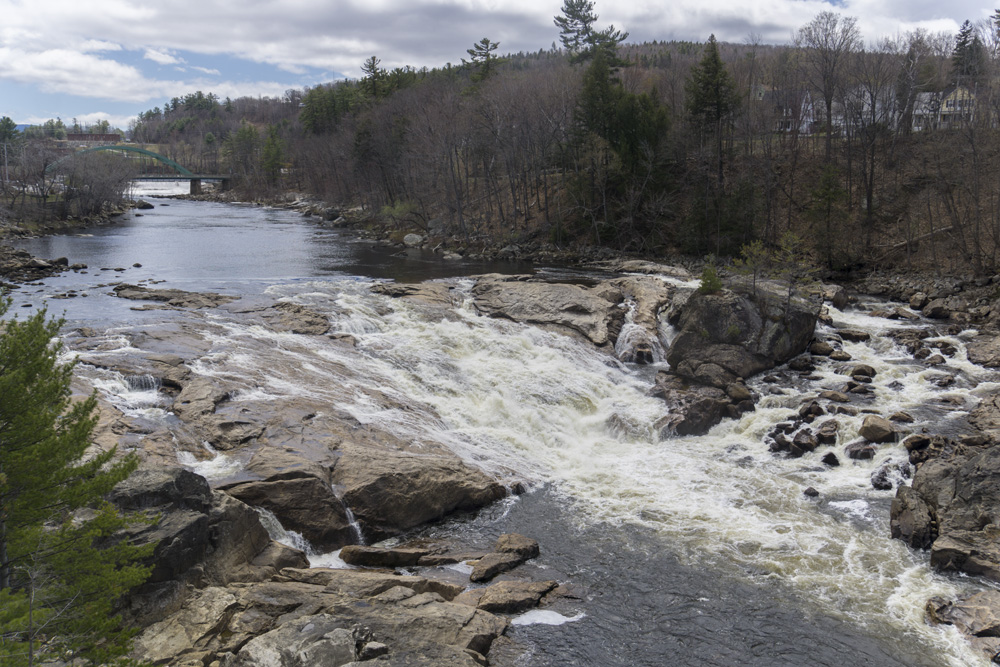 Access #1: Boivin Park looks like a good option though I do not know if you can get to the water there. It is on Bridge St just above the lower dam. So you would paddle across the lake to the base of the drop and find a way to walk up it. The other access would be from the bridge on S Rumford Rd, the eastern side has a dirt road but it is gated and off the river, so I am unsure if you can get down to the water there as well.