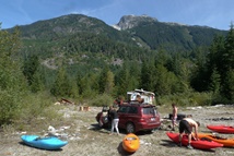 We actually didn't get the green light on Tatlow until an hour after we went to sleep on the sixth day (4th in BC). I hear Darin hollering that Will (a nice guy we met on the Cheak a day earlier) confirmed the trip. So the next morning we wake up and head south to Squamish planning for the Tatlow. However, the Vancouver gang had some issues, and ended up arriving late... and without a car capable of getting to take-out. With some hesitation we decided in order to save 4 hours of hiking (it was already noon)... to try to make the drive in my car. Well, 200 yards past the Ashlu Lake we bottomed out and managed to crush my exhaust and impinge it against my drive train. So... that was that, no Tatlow (we were not feeling the hike from the bottom).