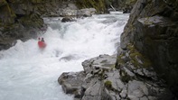 Ashlu's Mine run is certainly less famous than its downriver brother, the Box Canyon. But Ashlu offers some nice rapids in a similar, though less committing, box canyon. We put in at the Mine Rapid via river right. The irony is that the bottom half of the put-in rapid is one of, if not the, biggest rapid of the run... no warm up here. Below, several big, fluffy, and fun rapids continue down to a portage. The portage is long, maybe 20 minutes, and requires you to ascend up a dry creek before bushwhacking around a canyon, before then repelling (rather, using rope aid) down to the bottom of the portage. The portage rapid looks like one that would drown you for sure. A big hole leads to a bowl where the only water exiting appears to be under the surface. There is an eddy at the lip that would make this a 2 minute portage... but it looked super sketchy and is usually not taken. Below the river quickly opened up.