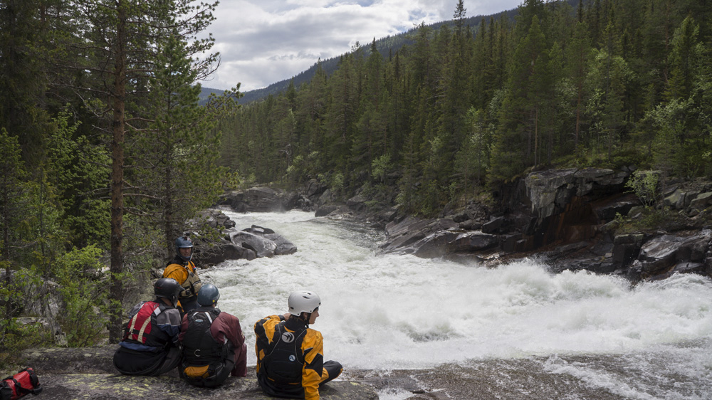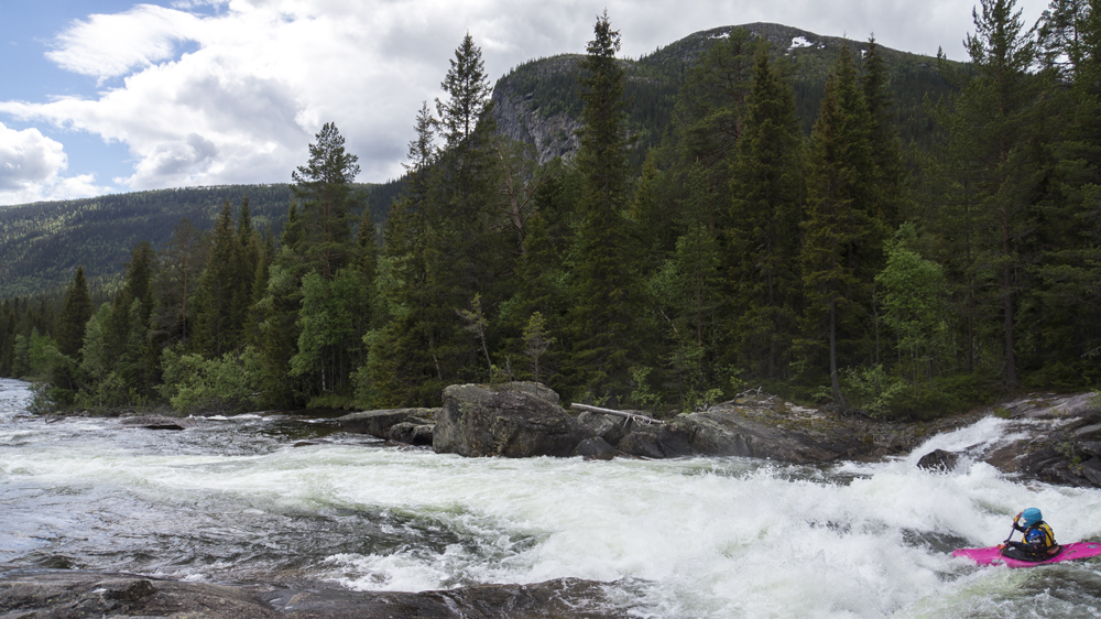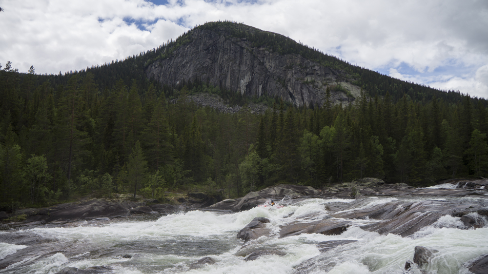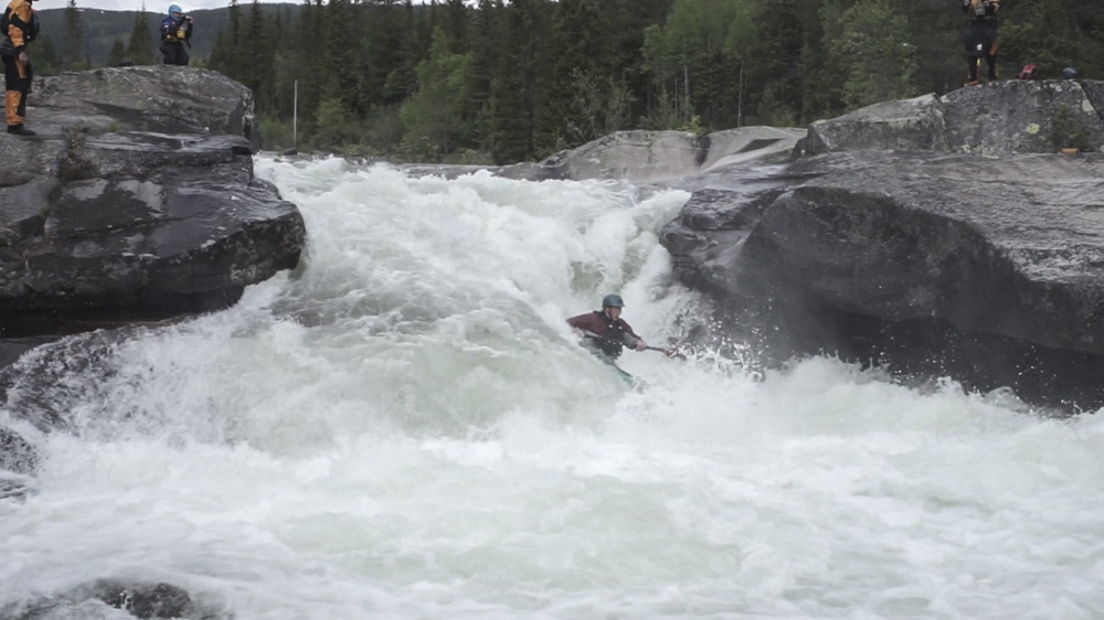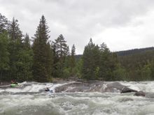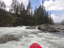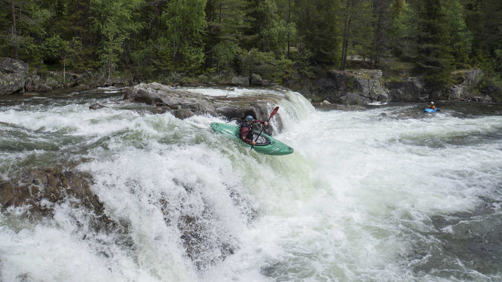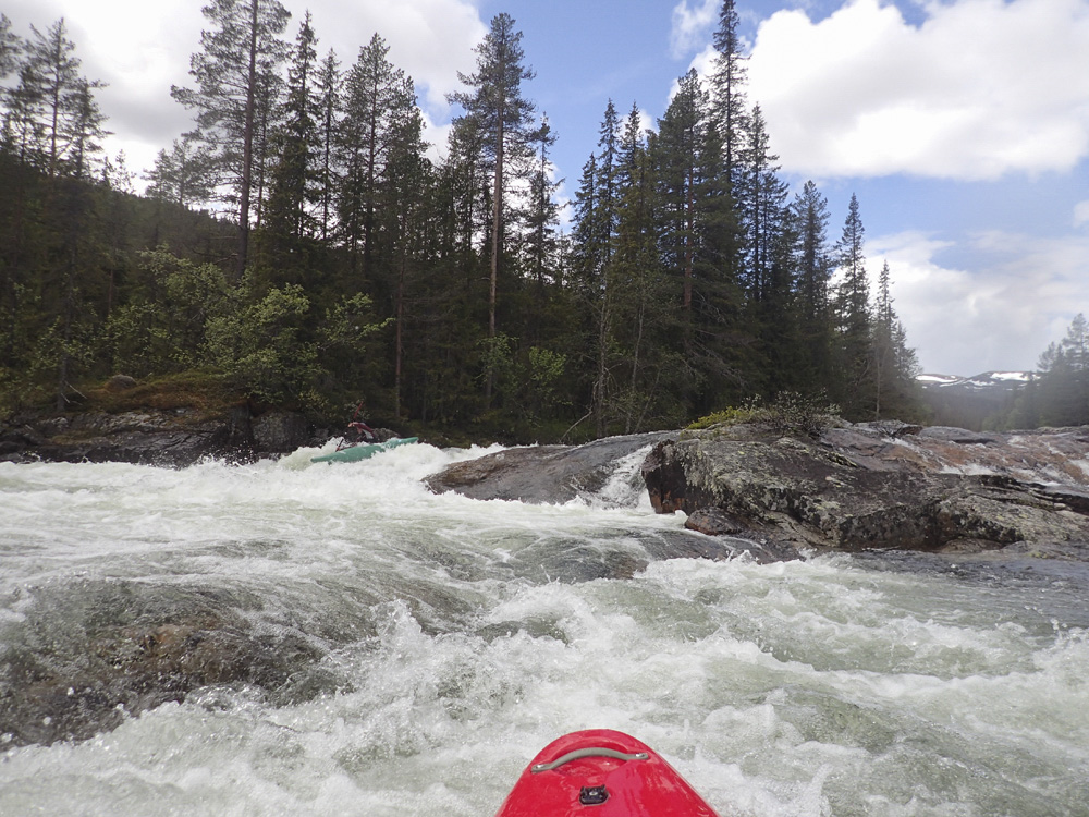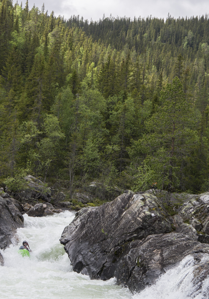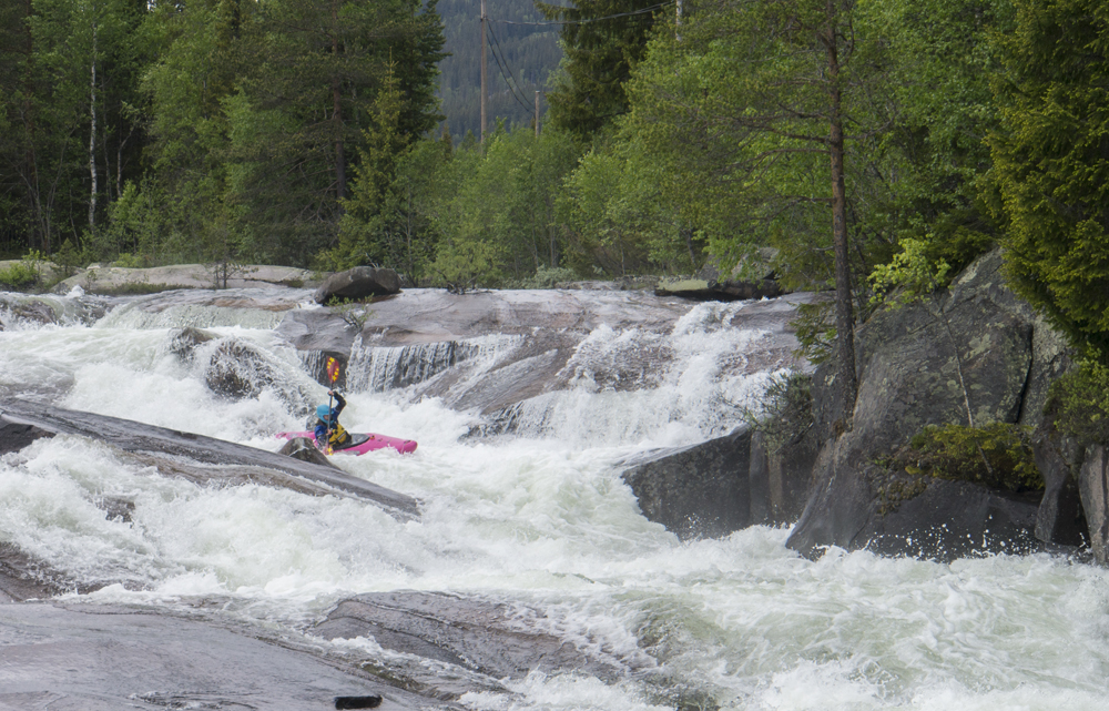Waking up with thoughts of having a mellower day to let our bodies rest after the full day of effort that the California Section proved to be, we drove to the Upper section on the Austbygdåi. As we drove up we knew that the Spånemfossen Falls was going to be a big drop, but were somewhat surprised by the road-side slide that looked very full of water and very full-on. We briefly scouted it and decided to further contemplate it when we arrived there on the river. Driving further upstream we were surprised by the steep powerful drops we witnessed, so much for our mellow day.