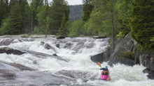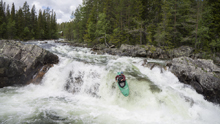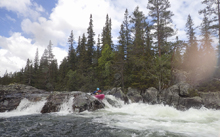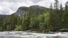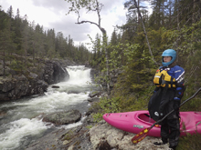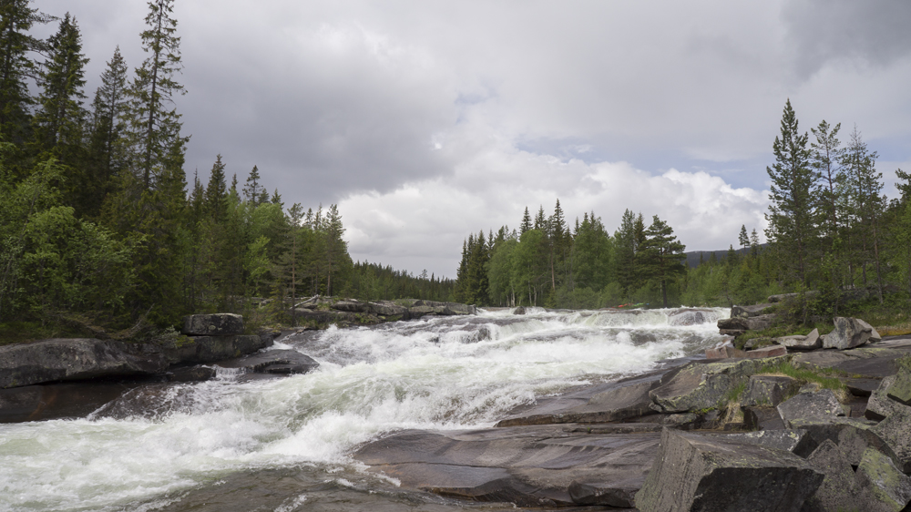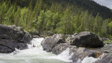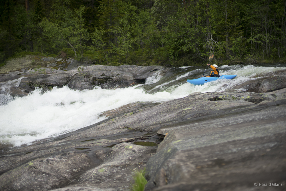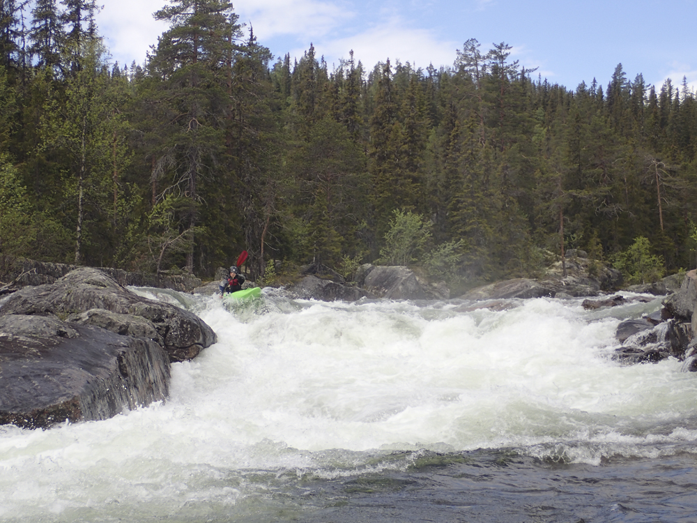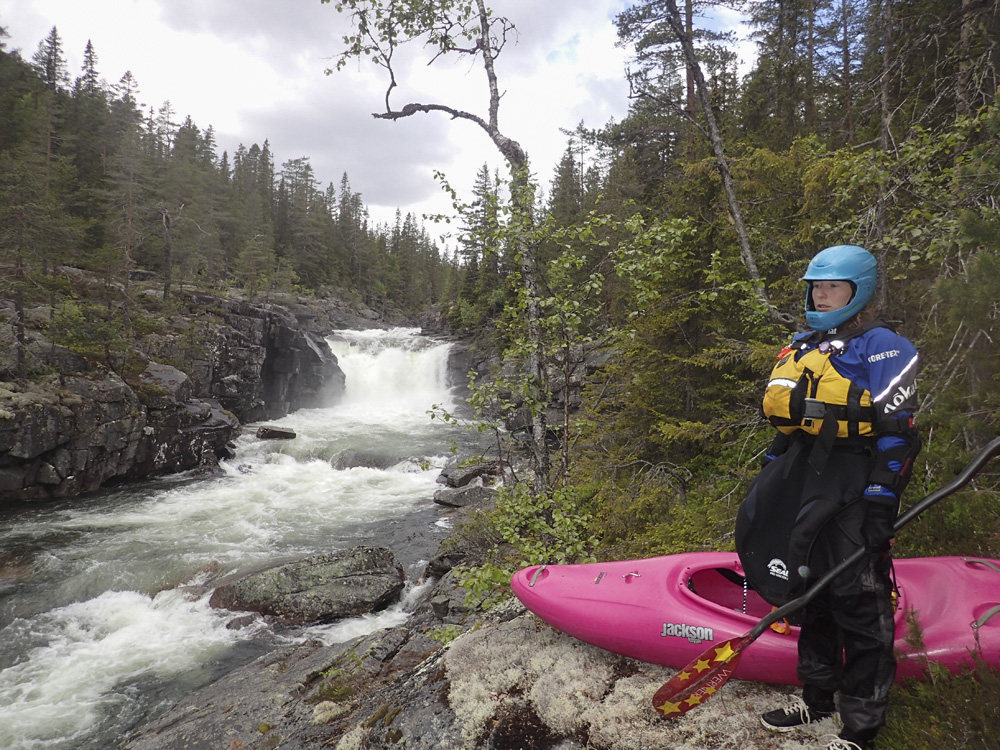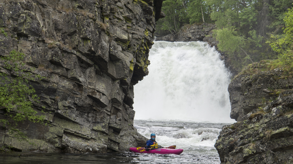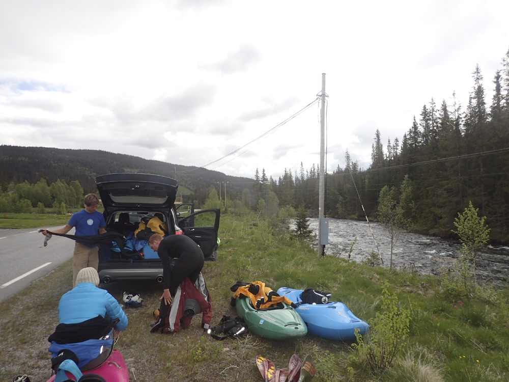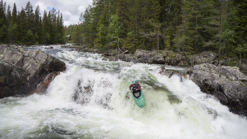 Waking up with thoughts of having a mellower day to let our bodies rest after the full day of effort that the California Section proved to be, we drove to the Upper section on the Austbygdåi. As we drove up we knew that the Spånemfossen Falls was going to be a big drop, but were somewhat surprised by the road-side slide that looked very full of water and very full-on. We briefly scouted it and decided to further contemplate it when we arrived there on the river. Driving further upstream we were surprised by the steep powerful drops we witnessed, so much for our mellow day.