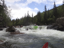 Big Hole (IV+ to V-). The next rapid had a quick ramp into a fold off of a ledge that dropped into a large hole. It turns out though as long as you were reasonably straight it kicked you right through. Will ran two laps!