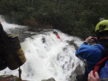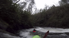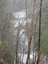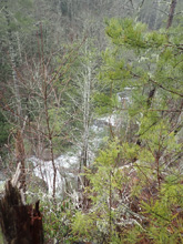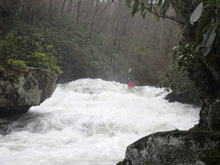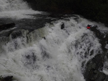 Suislide (V+). Most commonly portaged. If you run the falls immediately upstream, you will need to get out in moving water on the left, and then portage down the left of center part of the rapid... in the current. You can run the bottom half from there if you want, down a grove and into the main current where you would boof the bottom ledge against the wall. Or, if you portage both falls you can drop down the hill side steeply 20 feet downstream of the well traveled spur that we used to scout. With a tether, you didn't even need to rope boats.