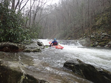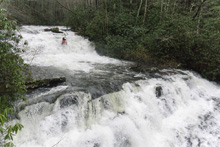 Slides and Ledges (IV). Several nice slides and ledges above the take-out. We ran the first ledge on the left. We then ran the next slide on the right boofing over the hole at the bottom. Those that tried to slide around the hole, just ended up flipping it in. Just embrace the full hole and hit the pad to boof the meat of it. One last little rapid occurred down the right wall which led to the eddy above Bald River Falls, and our take-out.