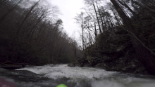 Finally, the river begins to open up and you start to get some nice rapids. These rapids pick up steam until you are at the top of Shallow Falls. Shallow Falls is an easy enough boof on the left, but 1) it had wood in it and 2) it pushes immediately off the very stout Suislide immediately below. There is only 40 ft of fast moving water and no real eddy between them. Scout thoroughly! If you run the Shallow Falls, find a way to beach your self on the left, and wade down to the lip of Shallow falls and portage down the middle steps, in the side current. We portaged both, using a steep hillside 20 feet downstream of a spur that can be used from the main trail to scout the falls. This put us in at the base of the falls. It looked too steep but in fact was totally ok.