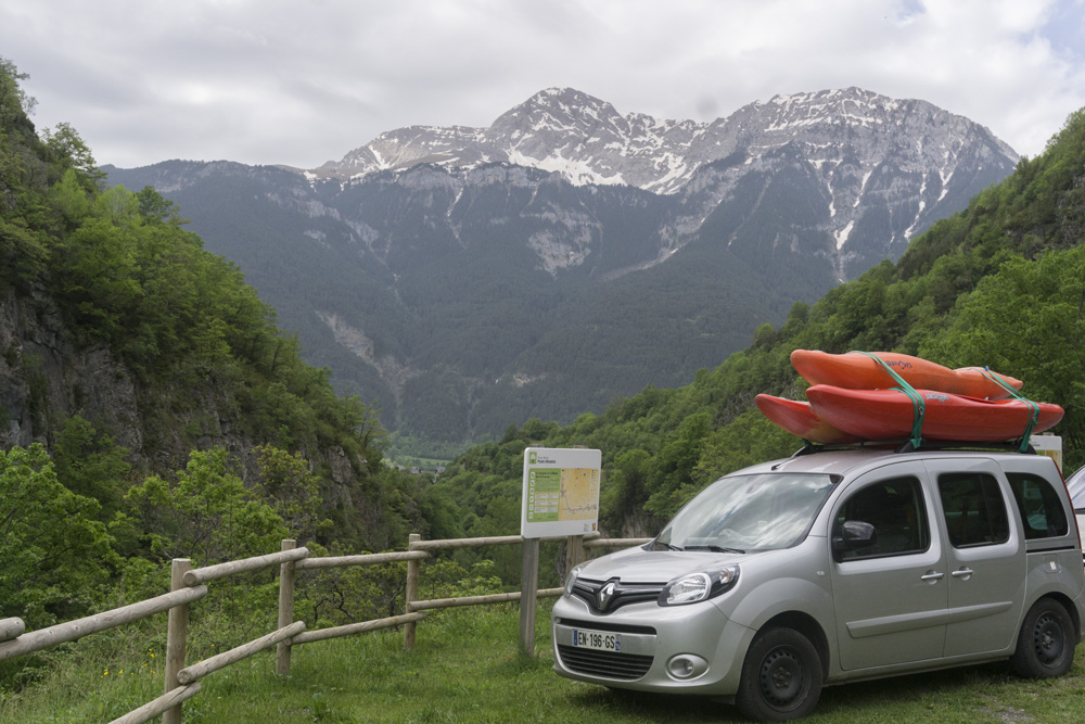 Put-in: From Bielsa, continue up A-138 for 8.1 km. Just before the bridge over the river, there was a nice turn out that we used.