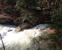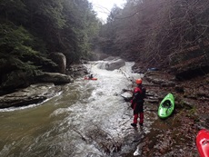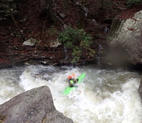 Armageddon (V). One of the more well-known drops of the run, this drop packs plenty of consequence in its gradient. Early 2015 we had to portage some wood in the lead in rapid. It was pretty obvious, and that part of the rapid was junky anyways. From there, ferry across to start in the river left eddy above the lip. Ferry to the right eddy where you can properly drive to the far left. From the eddy, ferry behind a large rock and boof far left into a small 1.5 boat eddy. Whatever you do, do not go down the far left channel, it is sieved and full of wood. Instead, ferry out 5 feet into the middle channel and slide down the left side of the small channel into a hole. Then eddy out far left immediately again. The exit is down the far right, enter right early and grind a rock to boof and stay right, below there are a few small ledges to navigate, just stay right and you are done with the rapid.