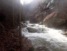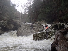 Fishbowl (V to V+). At our flow, this rapid looked horrible. The hole was just huge. And to make matters worse the left line was blocked by a tree. Basically, just down plug down the middle. Right had the most outflow. Most of us seal launched in on the right around the rapid.