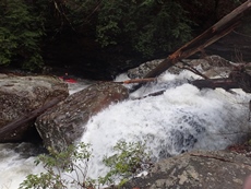 Woody (IV+ to V-). This section had some holes with some wood. First we went far left under a tree where a good size hole was waiting, stay left and seam the outflow. Downstream 100 yards was another large ledge with a large tree in it, keep power and drive left. Or sneak around it to the right. Beatings have occurred here.