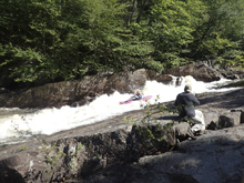 - Exit Boof (IV to IV+). Downstream of the Big Hole, you enter a nice straight away with some tricky off angle and offset holes. I just ran down right of center. This then rounds the corner and goes off a ledge, I liked to drive to the right and boof the flake just off of the right shore. Nice fun. Now, get out on the left and carry back up for another lap!