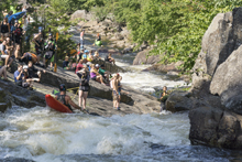 Big Hole (IV+). We scouted at low water and this looked like nothing. Was surprising to drop over without scouting it with water to find a big hole. We ran center driving straight perhaps a smidge to the left to punch the hole. To the right is a recirculating eddy. Downstream, the water flushes out and goes to rocks on the right downstream. Those ruin race times. If you are upright they are no problem. In all honesty, this is the hardest rapid of the run.
