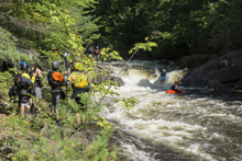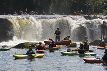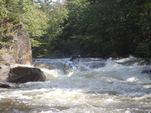 - Moshier Falls (IV+). So much fun, and despite the story in the intro, worth a scout prior. The scout trail is easy to follow and lets you see all parts of the rapid. It also allows for portaging (or laps), whichever way makes the day more fun for you. The first of four tiers was a nice small double drop, we ran far left with just a smidge of right angle and momentum. This then leads to the part that gets most people, the river bends left and slides into a large hole. Some opt for going far right, sliding down through the end of the hole. I liked the line on the inside left which rides the curler to the top of the hole. Super run. Sometimes it eddies you our far right. Catch too much of the curler and you are in the hole. Downstream 100 feet of boogie is the photo famous part of the drop, which is a nice 5 foot shoulder boof off of the left shore. Lots of people melt it. Just be aware if you swim, swim down the gut and not far left as the boof lands just past a crack in the rock that is apparently a sieve. The final tier is just downstream and a ramp into a fluffy hole that you run right of center moving left down the gut. Great fun! Walk up and run it again fun! Just below is take-out.