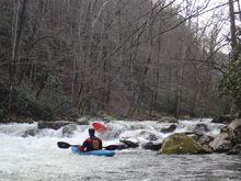 - S-Turn (III+ to IV). The biggest individual rapid on the run comes within site of the bridge where the gauge is. The river s-turns to the right, left and back right with some off angle holes to line up and punch. We went down the center of all of them which went well, but I can see the off angle holes and cross currents immediately behind them could give people issues. The bottom is a small ledge, I boofed a shoulder right of center, though really any number of places was ok to exit.