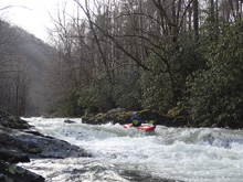 - Boof (III+ to IV-). A busy section of boogie ends in a river wide rock fence. There was an obvious boof left of center off of a shoulder of a rock. Below, is the first real pool of any sort since put-in.