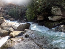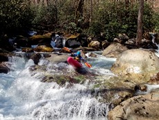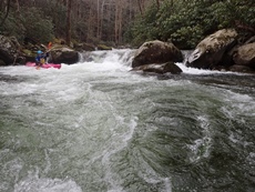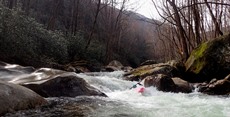 Most folks will put in at the bridge, 2.6 creek miles and 2.3 trail miles upriver from the parking at the NPS Campground. Some go a few hundred yards further to get Superman which is apparently a great boof followed by a series of ledges. Others will choose to take the class V aspects of the run out of it completely and put-in below Action Alley. Either way, stay on your toes, scout for wood and rock hazards often if you are unfamiliar with the lines. Additionally, I would suggest scouting Action Alley on your hike up the trail, as well as taking special note of the eddies above Monster. Both these sections are trailside and should demand a little extra attention. The rest of the run is steep boulder gardens with an occasional hole to punch through. There are literally no pools except the one below Midnight Hole. The run starts off with some smaller rapids amongst smaller rocks, but in my mind those are the most dangerous as pins and broaches can most easily happen here. As you approach Monster, the run enters its crux section. Monster is usually portaged and then you run one big rapid to the lip of Midnight hole. Below the action continues straight up to Action Alley, a sequence of big, tight, and continuous drops which define "fun" in the Smokies. Below, the river gets easier before become extremely shallow and congested leading up to take-out.