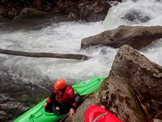- First Rapid (IV+). Scout the first few rapids as you hike up the trail. The first rapid involves a big flake boof on river right before finishing down the right. The next few moves all are bigger than they look from the trail. A few fun lines worked back to the left before the river bent left and got a little cleaner.