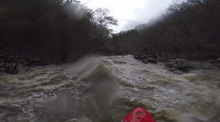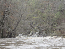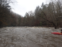 - Suddy Hole (III+ to IV+). At normal flows the lead in is mellower and the final ledge is more benighn, just avoid the pocket hole on the far right that causes problems for people. For us, I thought the rapid was by far the hardest on the run at the higher flow. But not where you would think the difficulty would lie either. We entered the lead in on the right, there was a large wave hole that we had to stay right of before we could jam hard over to the left to catch an eddy. We didn't know the lines and all we could see was a big horizon below. At our flow, we ran down the left channel which was a fine line with a small boof over a small hole at the bottom. The main ledge was a significant drop with powerful hole, though perhaps some windows did exists, we didn't actually scout. The part that I would call harder than standard IV is the ferry from right to left, after the entrance wave hole, above the ledge. Blowing this ferry couldn't be disastrous at the high flow. It is just a ferry, but a high consequence ferry. Call that IV if you want... for me, I would call it borderline IV+.