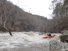 - Pinball (II to III-). At low flow apparently people run left of center through this ledge. At high flow, the river was a huge ledge hole. Diane boofed far left which was successful but I wouldn't recommend everyone doing it, as if you found yourself in the hole it would be hard to exit and hard to reach with a rope. I went far right down a mellow ramp.