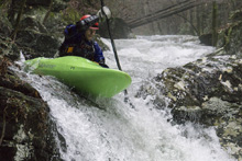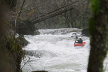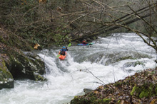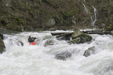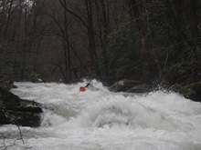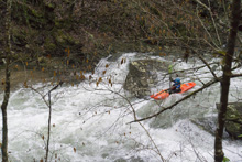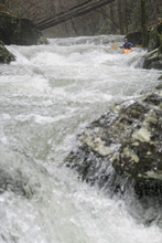 Forth Rapid (IV). Immediately downstream, was wood blocking 75% of the river, but having a small opening on the left. We went down the left and boofed through this rock infested rapid. It is by far the least clean. Part of the rating is that the next rapid has an ugly rock in it that I wouldn't want to swim into.