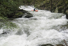 Fifth Rapid (IV). A small ledge formed a surpringly strong hole, boof through that right of center, and then line up for the main channel which ramps down through a soft hole. To the right of the ramp is an ugly rock that I would not want to tangle with.