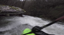 - First Rapid (IV). Not far after the river makes a 179 degree left turn, you get to this first rapid. It is unmistakable as the river drops out under you. Scout left or eddy hop. There are three parts to the rapid. The top part was a tongue down the right. The second was a flake that was easiest left of center, though right of center also went fine though a seam could bury you. The final third part had two options, a easy micro channel boof on the right or a boof over a fluffy hole on the left. If you run left, the right side of the ledge was best.
