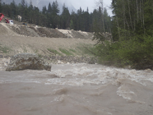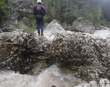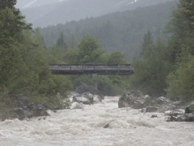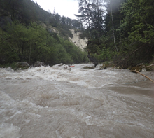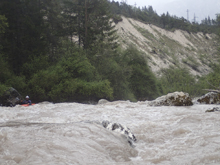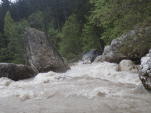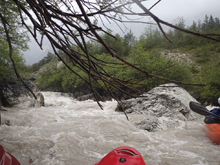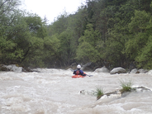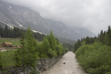 The run was called the "Pearl of the Dolomites" in the German guidebook that we were provided by the Italians at the put-in for the Defereggenbach Waterfalls. So which high hopes we shoved off just as the rain really started and the mountains disappeared. The run was supposed to be relatively short. So I anticipated it would be action from the start. The river was high, there was a lot of construction, and all we had was splashy class II for a mile or two in an ugly little canyon with construction debris sides to it. I began to dread thinking that this construction must have buried whatever used to be there. But to our luck, just around the corner, the rapids began and once they began, they did not cease.