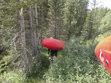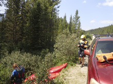 Diane had bought tickets to fly out of Calgary, and we were beginning to run low on things to kayak. It was almost August now, and with the low snow pack everywhere out west, the creeks had been dry for a few weeks and the rivers in the Banff and Jasper areas were mostly easy affairs. We had hoped to find a group for the Yoho Canyon which is class IV to V, but failed due to the Toby Creek race which was also going on at this time just a few hours away. So, we decide to run the Upper Bow, which was reported to be class III with some class IV.