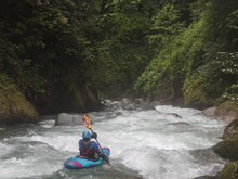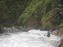 First Rapid (V). Scout right before running. We entered right and then eddied out far left below the entrance but before the main part of the rapid. The main part of the rapid is a pinch down the left shore. You then want to stay left, but lots get pushed right. Boof the next ledge which lands you on a ramp which slides down into a hole that is easy to get your nose up on assuming you are straight and in control. Set safety on the right.