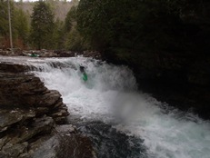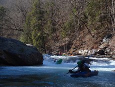 Vortex (IV+ to V). The best and most challenging rapid of the run. Slide down the center rock, try not to slam the wall, and then boof through the holes below. The exit ledge is also very sticky and best run right. Portage is on the right and requires team work.