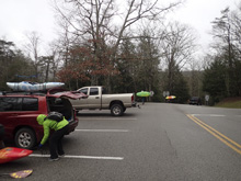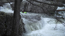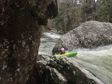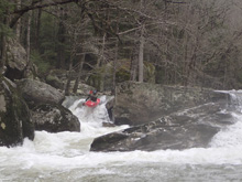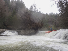 Put-in: Head back towards Mt Crest on TN-30. After 6.2 miles, turn right at the Fall Creek Falls State Park sign onto TN-284. Follow this for 3.1 miles. You will cross Rockhouse Creek (forms the small volume 85 footer next to Cane Creek Falls) and then you will get to a parking area right near Betty Dunn Nature Center. We parked here on the main road. We then walked back down the road the way we came for 100 yards, crossed Rockhouse Creek and then took the Cable Trail (not the Paw Paw Trail) down to the base. Note, that the trail is very steep scramble down 75 degree natural rock steps. If it is frozen, it would be very dangerous. We lowered boats down through the top half via ropes.
