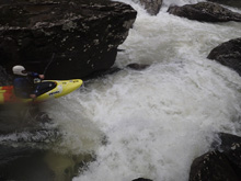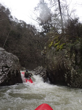 Slot #1 (IV+). We boofed down the middle of the center channel. The first flushed out of their eddy and ran it. The rest were given a "he is ok" and we followed. In hindsight, there was better lines using a slide just left of our slot. Oh well. I plugged deep into the slot and came out upside down for a quick role in a rocky pocket. Below there is 100 ft of boogie.