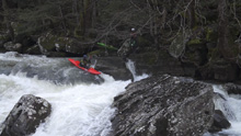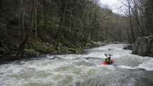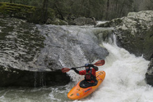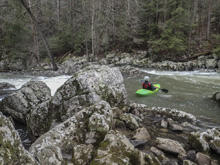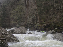 Boof (IV-). Immediately below was a great boof that we ran far left. The hole was decent size and the next step was super congested with wood in play. We ran a small slot on the left of center into a 1.5 boat eddy. From there, we ran down the left channel in front of an undercut we carried right momentum to avoid, This then turned into boogie that we ran down the right before there was another short mellower section of 100 yards which led to a riverwide log.