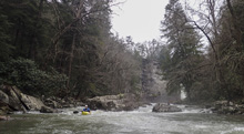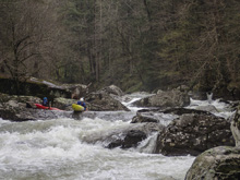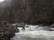 Putting on you quickly get to the rapids. The river is a lot like nearby Bee Creek, or a harder, smaller, and steeper version of Caney Fork. Rocks are sieved or undercut. And rapids tend to be fairly long or multi-tiered. We quickly figured out that the 7" we had felt like a straight medium flow. Not low by any means. In the second or third rapid, we ran into a lack of eddies due to miscommunication with the one person in the group that we don't often boat with. Due to that miscommunication, half the group flushed through a sporty slot on not much more than "it goes" beta. The other half went into it with no more information but in less "flush through" it fashion. Luckily it went well. Not far downstream is Towers, and then the river eases up for a short ways. You collect more water, and then approach Airplane Turn and Hallway Falls which come in quick succession, which then leads quickly into boogie that culminates with Rear Entry. Below that, the river takes a big step down to class III for about a mile before it again steps down this time to class II where it stays until the end. Near the end, the river begins to spread out into multiple channels. We stayed right throughout and this worked out fine. We also found that even throughout this bottom section we had plenty of water. I only hit bottom a few times.