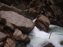 Crux 2 (IV+). Also unportageable and unscoutable... and this one also has limited eddy at the lip. We entered left which was a little bangy and then the river slides down to the left and into the wall, try to slide with some right angle. Below the canyon tightens to 4 or 5 feet wide.