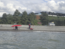 This run won't be done commonly... it is all non-descript class II with a few fun splashy class II+. We did it because after doing two laps on the section in the National Park, we wanted to float the entire way down to the Black Sea. So we did. There was one quick portage under the road bridge high above, where the water when into small pipes. This was a construction zone so I imagine it will change again. We then hit the Sea and dried our gear on a beautiful day while enjoying the view of the distant skyline of Batumi.
