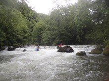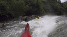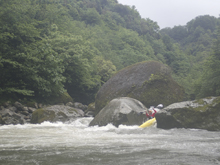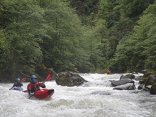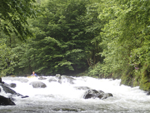 Big One (IV+). This rapid has some hazards in it, so it should be scouted on the right. Note that the rocks are super slick! The line at the top is off of the left wall, boofing over a folding seam. Then, get to the right and hug the inside of the large house size boulder. The left side of the channel drops into some nasty pin rocks. As long as you are on the right tongue you are good. Then, turn left and exit with the water.