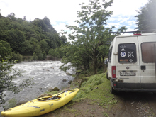 - Normal Put-in (III-). The normal put-in is above one last kinda steep and junky rapid that was best run far left. This is under the road bridge that you drive up on. Immediately below, there is a confluence with a sizable tributary (Sachokhia) which doubled our flow. Below, rapids continue.