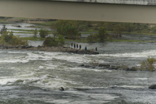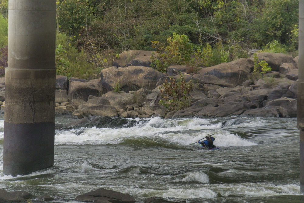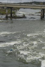 - Tie Snake Rapid (III- to III). Immediately below the pedestrian bridge is this nice rapid. At 3 generators there was a sweet kickflip or wavewheel wave at the top of the rapid on the left. The rapid itself is just a dynamic wavetrain with strong eddy lines at 3 generators. Lower flow is gets creeky. I imagine at higher flows it starts to flatten out. The flow from this rapid moves quickly downriver. So it is not the place to start having issues. At 3 generators or higher you can sneak down a far left channel around this rapid and the next rapid to take the risk out of accidentally flushing into Cut Bait, if you so need.