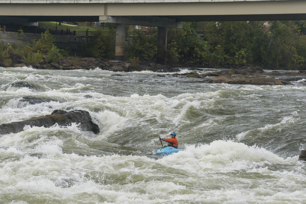 Put-in Walking Lap: If you want to just walk to the lower put-in to session the lower rapids, cross the street from Whitewater Express and go left on the Riverwalk. Once the river is just a vegetated embankment, between the two buildings on the left, look for a small trail that leads down to the river on the right.