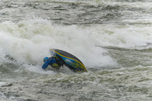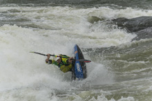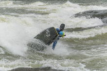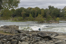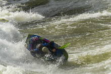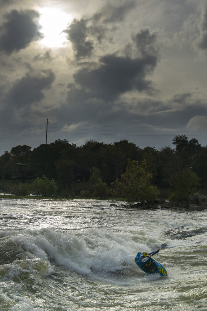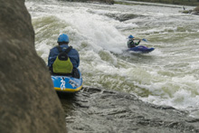 Good Wave. At the bottom of Wave Shaper Island is the main attraction. A big fast wave hole! At 3 generators you could push and pull your way up the eddy on river left along the island. But, for me, it was just easier to get out and walk 20 feet back up for each ride. Apparently at higher flows when the pool fills in a little more, the eddy access gets easier. This was the biggest wave I have surfed in a playboat. Felt like Garburator on the Ottawa. Really good fun. Though it turns out I suck at playboating waves like this. I guess no practice ever on this type of feature would do that. Additionally, at three generators, immediately next to surfers left of the wave, is a small hole that you can loop and cartwheel in. It had a name, I just don't recall. And for those with kids, the island has nice grass and small stairs that lead down to the pool for kids to play!