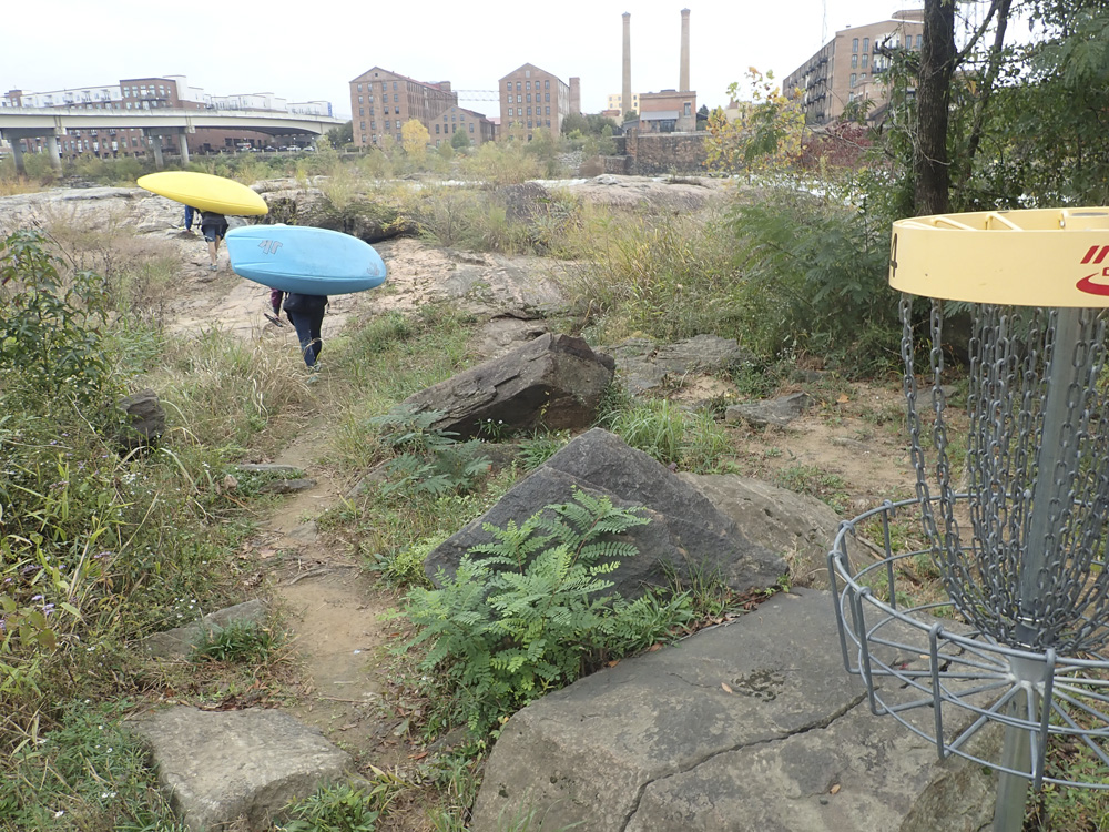 Short Take-out to Walk back to Whitewater Express (Mi 2.0). If you are walking back to Whitewater Express, paddle as far up the river right channel as you can. Get out and walk up. There was some construction on the Riverwalk, so we went under the river walk and under the road to a grassy field that led us back to the store.