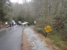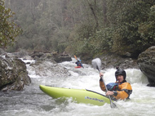 - Split and Boof (III+ to IV-). After a straight away, there is a large rock splitting the river. The left is the normal line, though it also collects a lot of wood. Below there is a nice boof on the left to exit the narrow gorge.