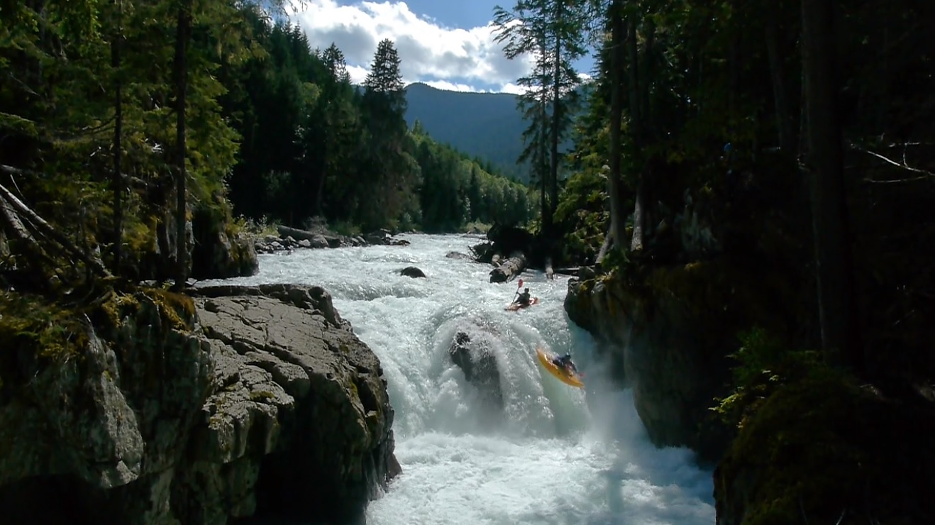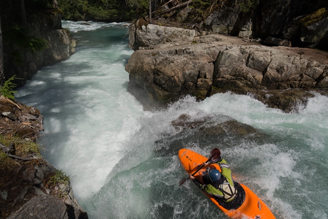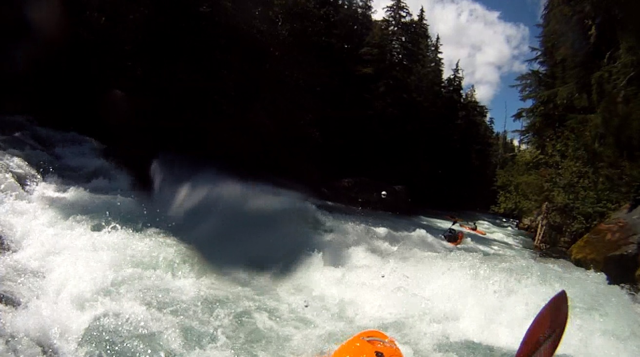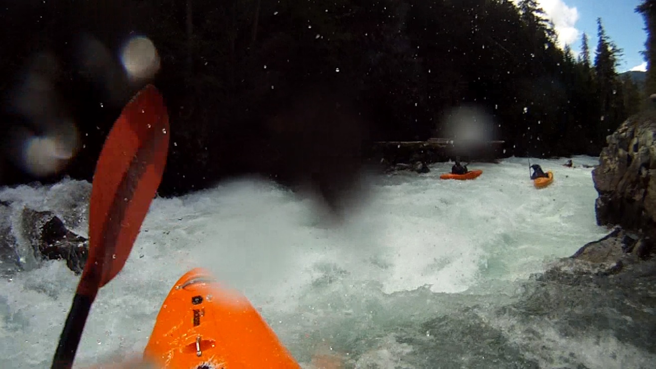 Put-in: Go up Cheakamus Lakes road another 2.7 km. Look for the turnout on the left that has a Riparian Zone sign with a whole bunch of kayak stickers on it. Two trails drop, one goes to the right and one goes to the left. Take the one to the left to put-in at the lip of the falls or portage the falls. Putting in above can mean running the falls blind as a log blocks the eddy from upstream entry to scout the falls.