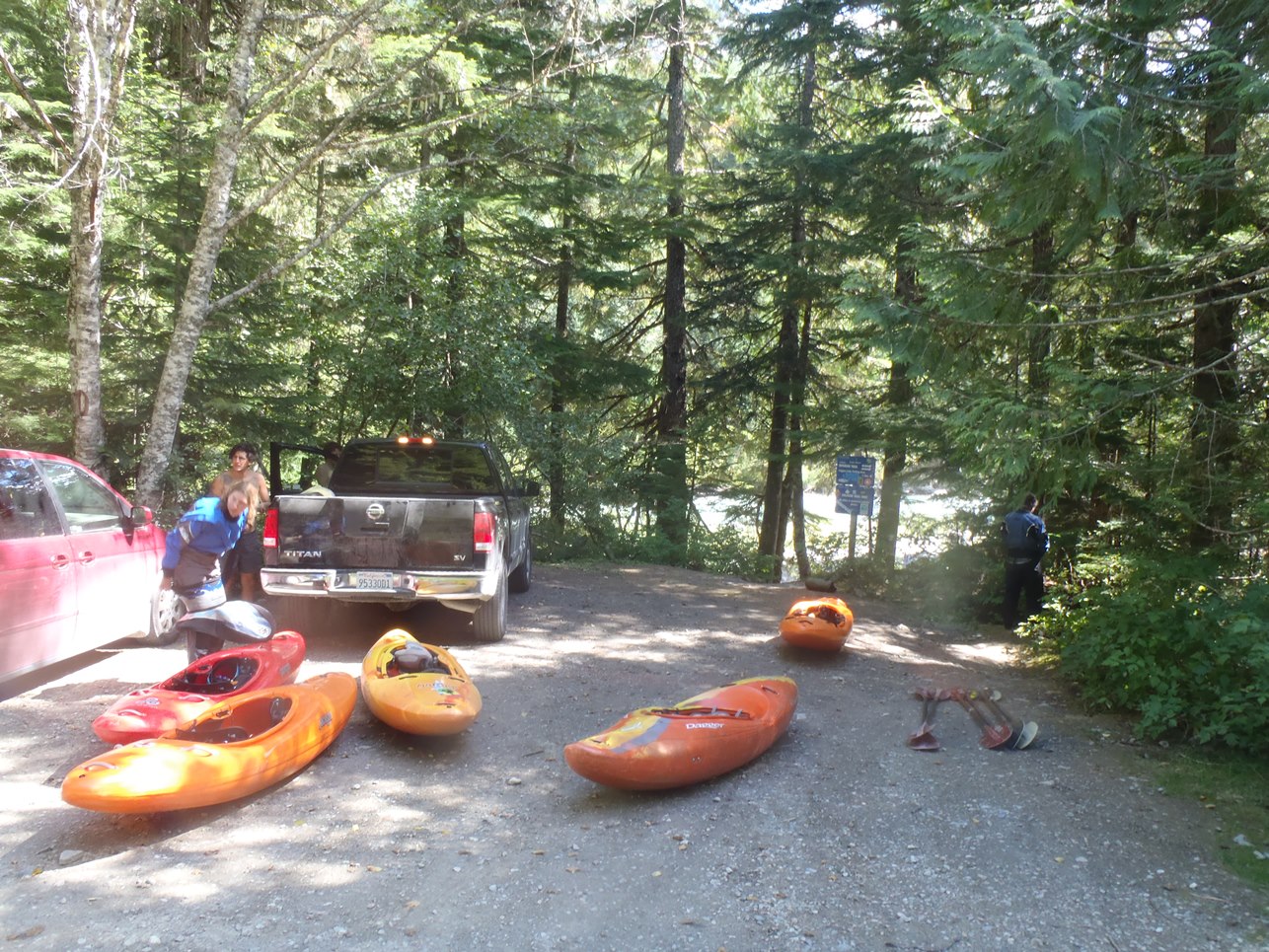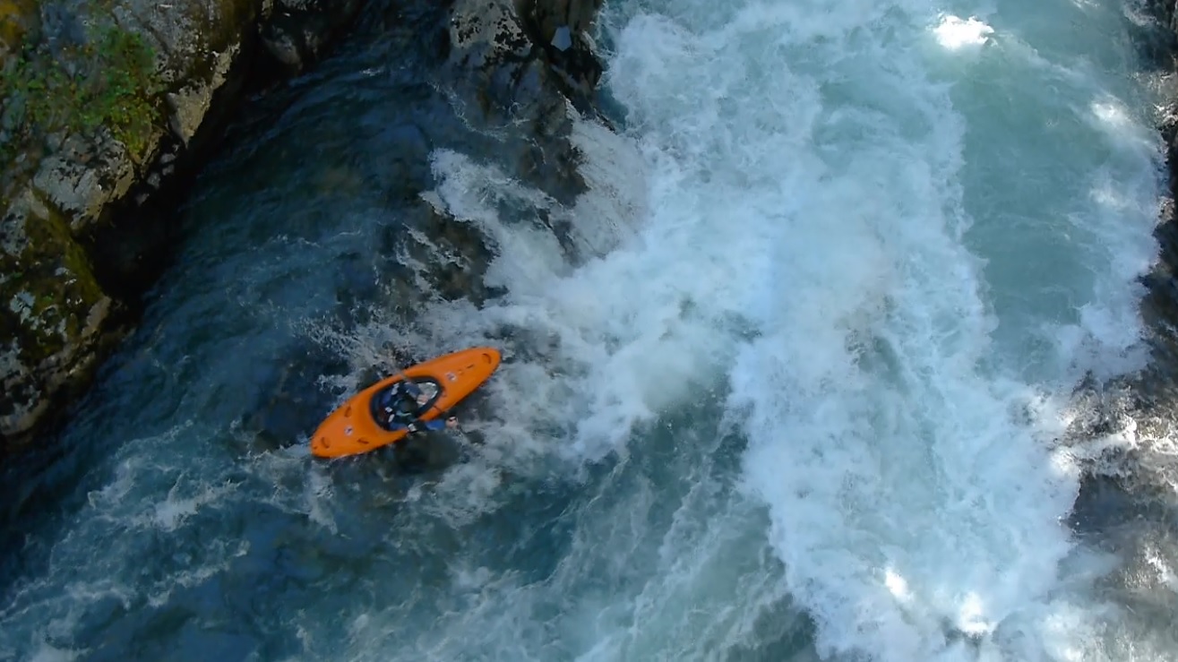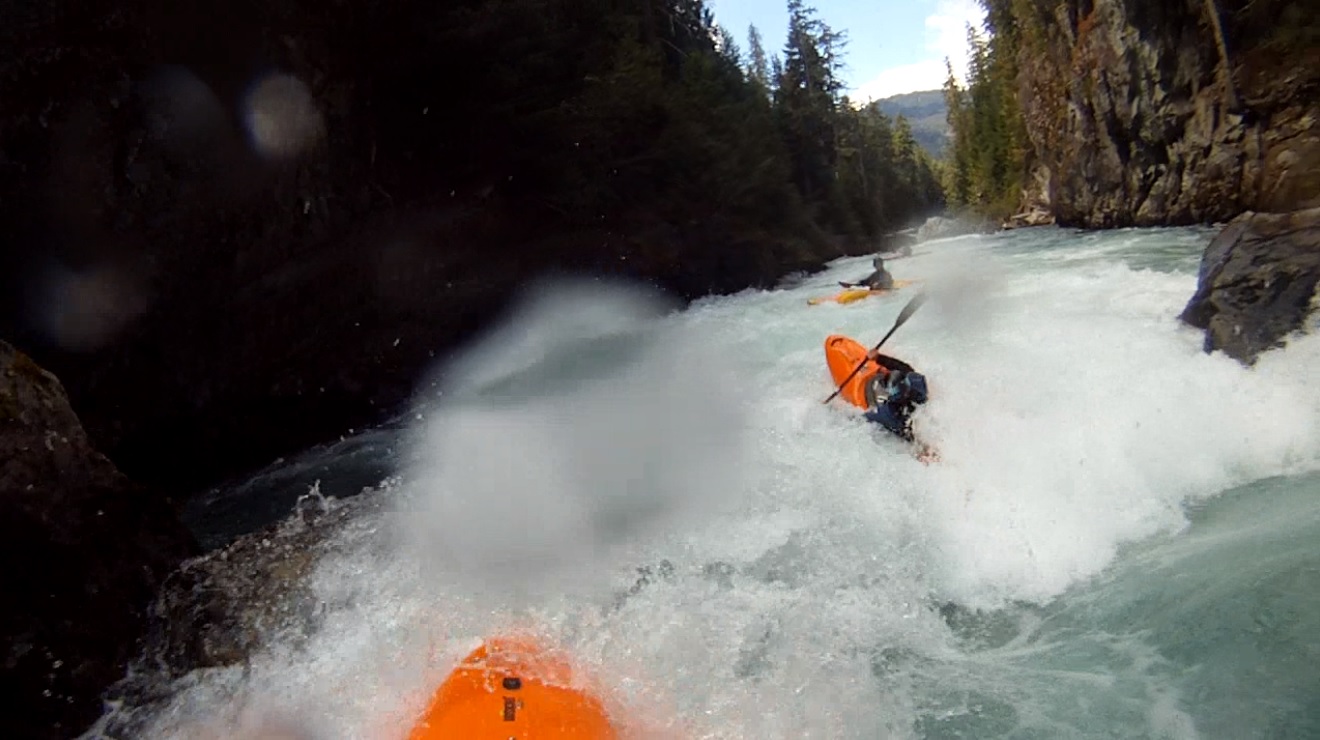 Put-in: Go up Cheakamus Lakes road another 2.7 km. Look for the turnout on the left that has a Riparian Zone sign with a whole bunch of kayak stickers on it. Two trails drop, one goes to the right and one goes to the left. Take the one to the left to put-in at the lip of the falls or portage the falls. Putting in above can mean running the falls blind as a log blocks the eddy from upstream entry to scout the falls.