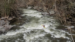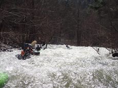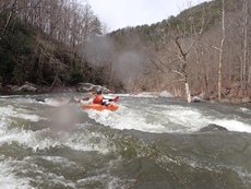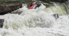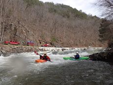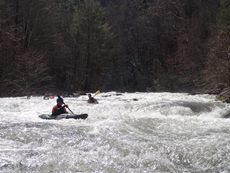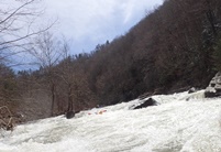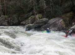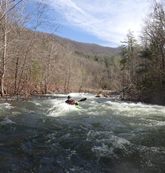 Bear Creek Falls (IV to IV+). A few different lines to choose from. You can stay right throughout, boof the main falls (though be aware that the landing is full of sharp rocks), the creek line is a small channel right of center that you take driving right for a double boof over a fun bottom hole. The hero line involves very at the lip of the main falls, avoiding getting slotted in the middle, and then finishing the same way as the creek line. Anyway you go through, catch eddies on the right below as the next rapid starts 100 feet downstream and is not desirable to swim through.