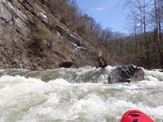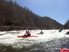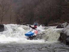 Bear Creek Entrance (IV). Lots of lines to choose from, one fun one involves moving right to left across the shallow center at the top, this leads to a meaty boof over a hole, then some time to get up speed for a nice ledge on the left that lands between a pocket and a seam. Staying right is easier, but also has a hole or two to punch. There are eddies just above the falls to catch.