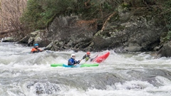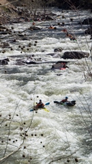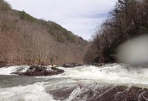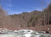 - Tapoco Lodge (III+ to IV-). As the river begins to split into different channels and the lodge is next to the river, you can choose any channel with enough water. Common lines involve heading to the right at the top or staying in the left smaller channel for a series of fun boofs. The left side is a little less forgiving as there is a rockier exit if you end up staying left at the bottom for some reason.