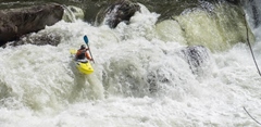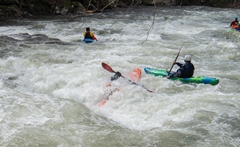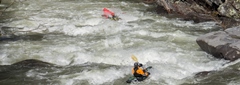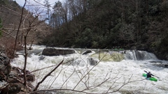 Yard Sale (IV). Just below Tapoco Lodge, the road crosses the river and you are immediately deposited in the entry to Yard Sale. Catch an eddy after the previous rapid if you don't want to run straight through. The top has a big hole on the left that you can either boof or avoid by working far right in the lead in. The second tier can be run right of center between two holes, or there is a great small channel far right that can be shoulder boofed into a folding hole. The bottom hole has a window on the far right, or with a good stroke can be run straight through at most flows. Downstream another 100 feet is another hole that is easy to avoid to the right or fun to boof off the shoulder of the midstream boulder. Below, it mellows out before the recovery pool. Downstream is one more small rapid with a fun boof off the right side of the midstream boulder before the river hits the lake.
