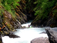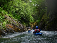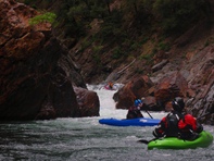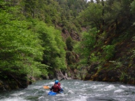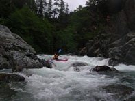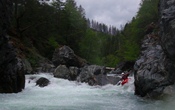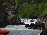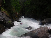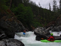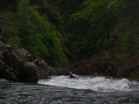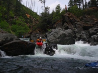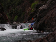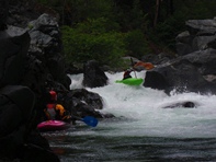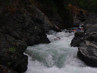 First Rapid (IV+). The first rapid can be seen from the trail on the way in. Move right at the top and boof the hole below.