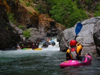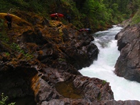 - Portage (V+). I believe this rapid has still yet to be run. Two massive holes bounce off each wall. One at a time, catch the eddy on the right (seriously, one at a time, the rest should wait well upstream) and portage on the right.